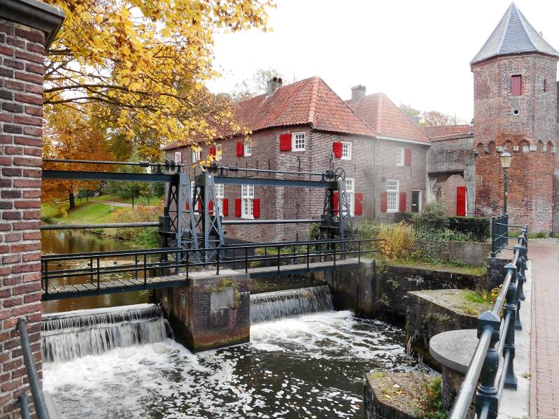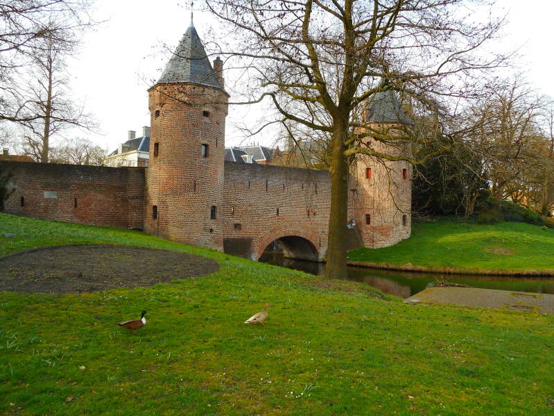 De waterdoorgang in de stadsmuur werd mogelijk afgesloten door een valhek en bewaakt door twee huizen, een situatie die vergelijkbaar is met die bij Huis Tinnenburg.