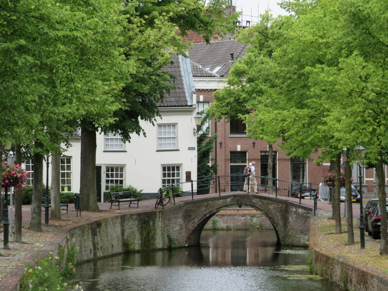 Aan de overkant van de gracht zie je de tuinen van de Muurhuizen, zoals de Bollenburgh, het pand waar Johan van Oldenbarnevelt (geboren in 1547 in de Van Oldenbarneveltsteeg) gewoond heeft.