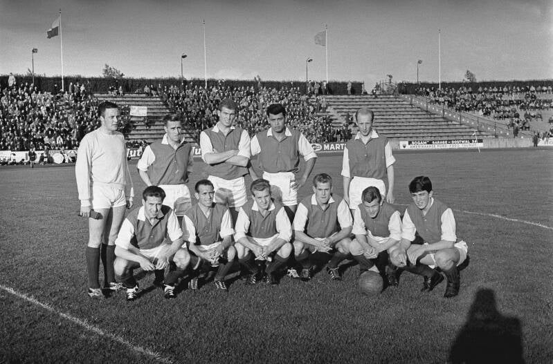 26 Juni 1963 Staand: Heitman, Hageman, Smits, Van der Velde en Dielissen, onder: Nederhand, van Eeden, Surstedt, Maas, Markus en naam onbekend. Promotie Competitie 2e divisie, BVV – HVC 2-1.